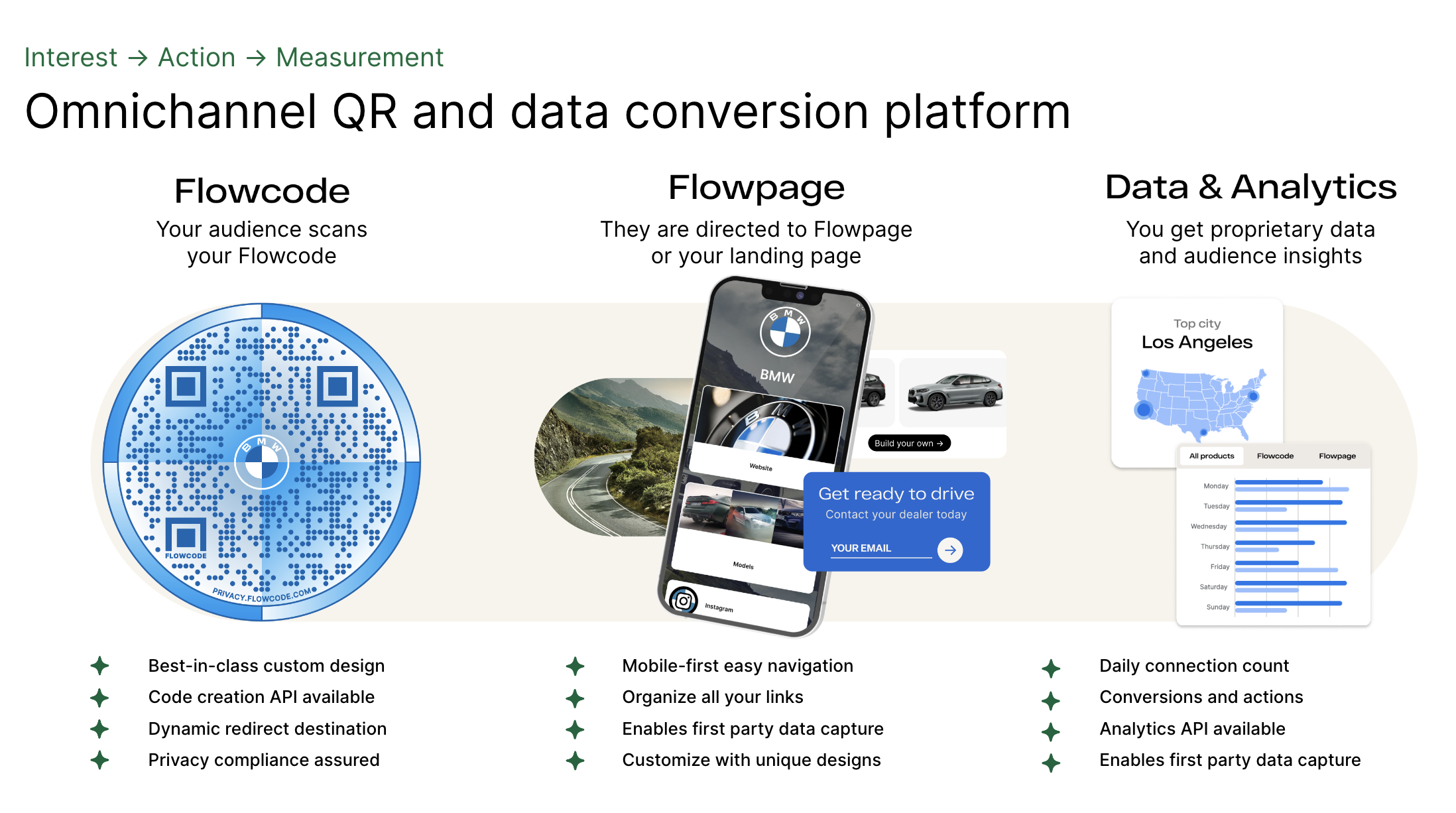 Flowcode is the #1 trusted QR provider for instant conversions and real-time data. Flowcode offers offline to online tools such as first-party data collection, next generation geo-reporting data, mobile-first landing pages and API integrations. Founded by the former President of Google and CEO of AOL, Flowcode enables businesses to turn any point of interest, into a measurable point of action.